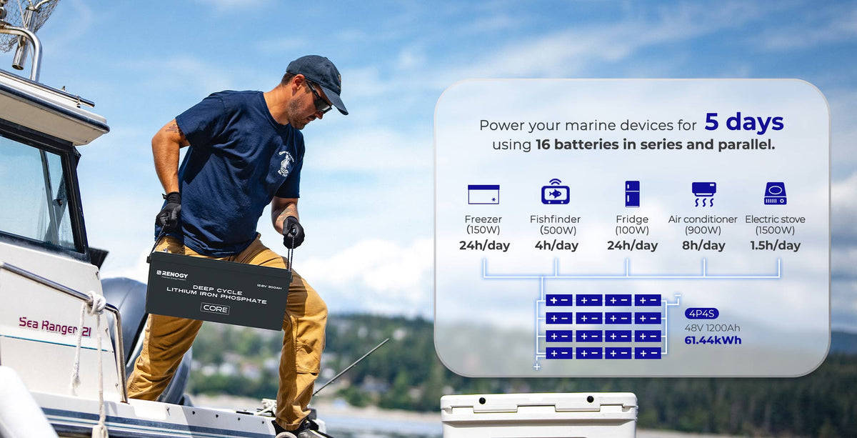 Ja, Renogy 12V Core Series-batterijen kunnen in serie worden aangesloten om de spanning te verhogen naar 24V, 36V of 48V voor een off-grid energiesysteem. Voor maximale vermogenoutput kun je eerst de batterijen in serie aansluiten en vervolgens de seriesets parallel verbinden (gebruik daarbij hetzelfde batterijmodel) om tot 40,96 kWh te bereiken.