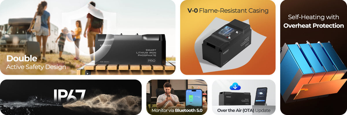Renogy’s veiligste 12V 200Ah LiFePO4-accu, ontworpen voor gebruik in alle weersomstandigheden.