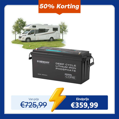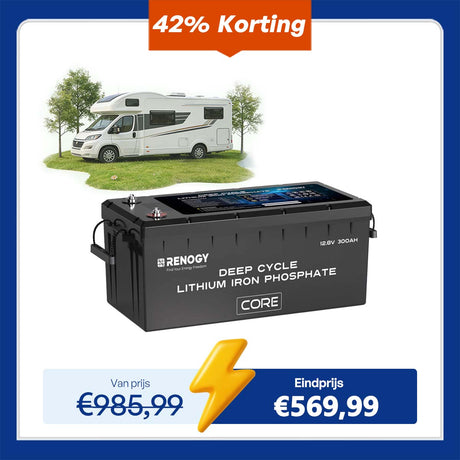 Renogy 12V 300Ah Core Mini accu’s bieden tot 5000 laadcycli bij 80% ontlaaddiepte (DOD). Ze hebben een 200A Battery Management System (BMS), IP65-bescherming en een robuust ontwerp om aan de eisen van diverse omgevingen te voldoen.